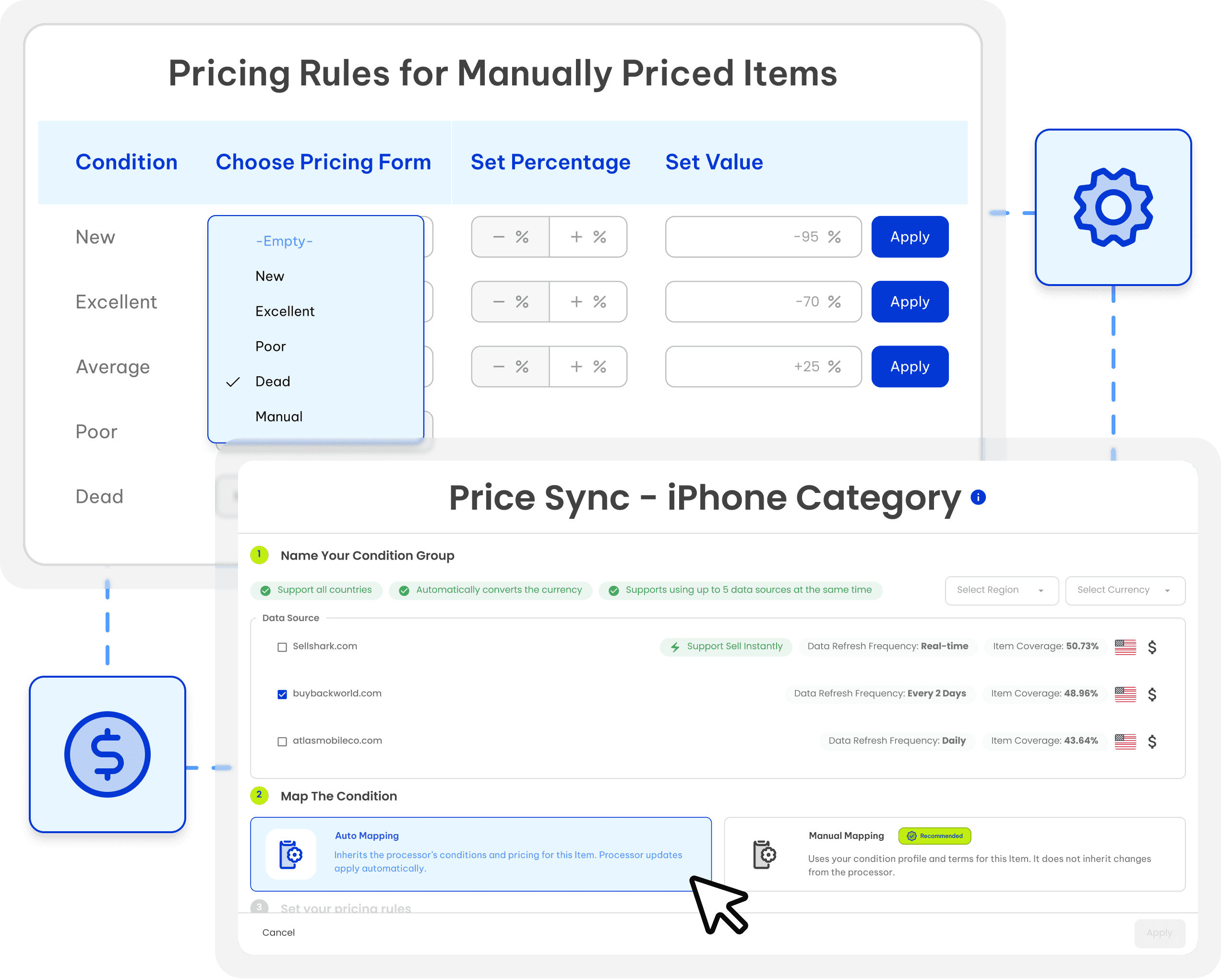 Pricing Rules & Controls define how your trade-in program prices every device. As a result, execution stays consistent across channels. Configure condition grading, set offer logic, and manage pricing updates across large catalogs without editing items one-by-one.