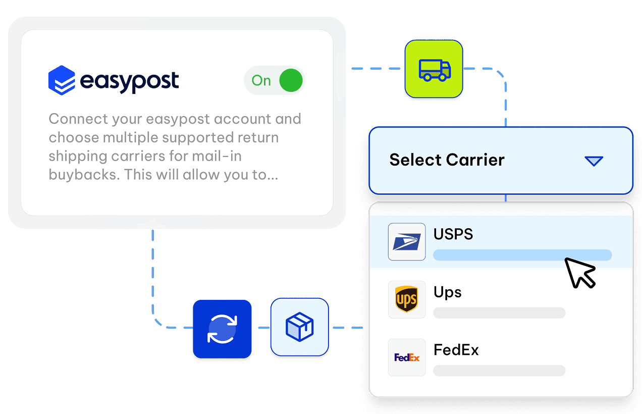 Automate trade-in shipping labels, tracking, and carrier selection. All powered by EasyPost and fully connected to your Reusely workflows.